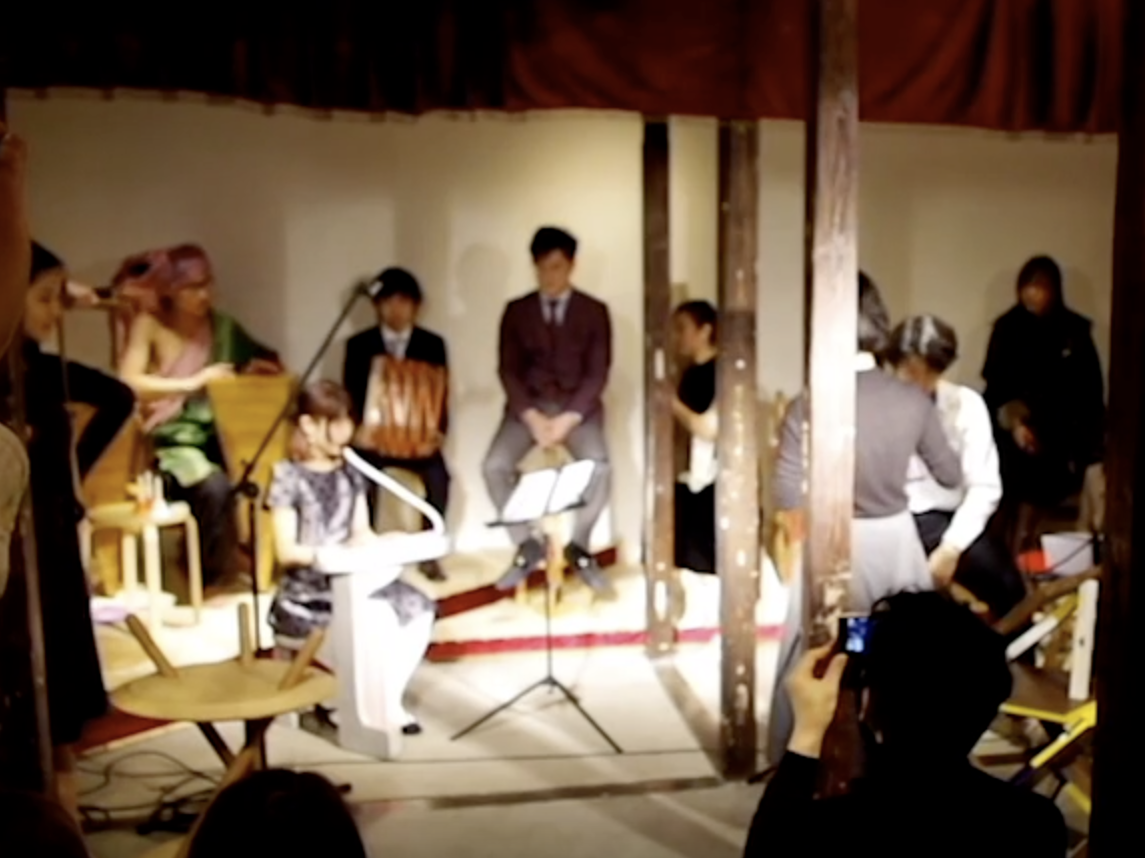 座った人は、必ずこの「座楽器」の中に入り込んだ様になり、共鳴腔の真空部分を演じる。音は震えであり、震えたとき音となる。共鳴腔となった身体は「外」と切り離された共鳴世界へ迷い込む。