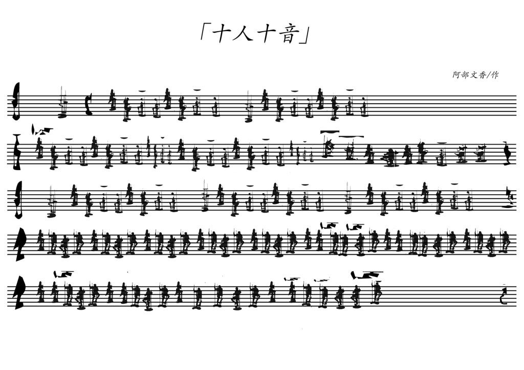 まず、視覚的に理解できるように、椅子に座った人々の写真を、シルエットや白黒画像に置き換え、記号化しました。それを、コードごと、指示ごとに座り方とイメージを持った記号を割り当てます。また、拍子、長さによってそれぞれ、画像の比率、面積が指定されます。それらをコードの幅の8領域に分ける六線譜上に、コード記号の最低音の音域によって、上下に配し、指示記号を加えました。こうして、椅子に座り共鳴を感じた人々が、読み取り得る楽譜作りを試みました。