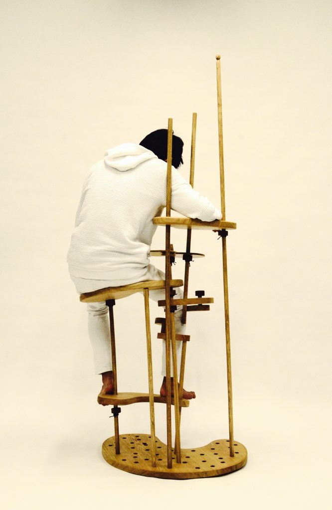 人によって組み変わる節の多いこの椅子は、楽器のチューニングをするときのように繊細に身体と楽器を探り動かし、椅子と自分の身体重心を探しながら、着るようにして座る。筋肉は震え、共鳴腔のなるところにあり音は生まれるように座ることを試みる。