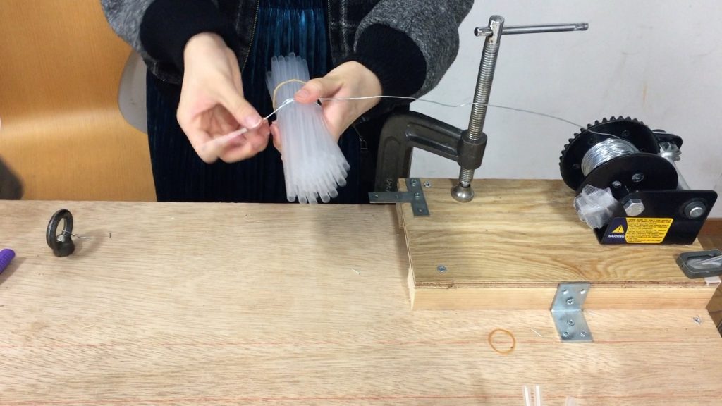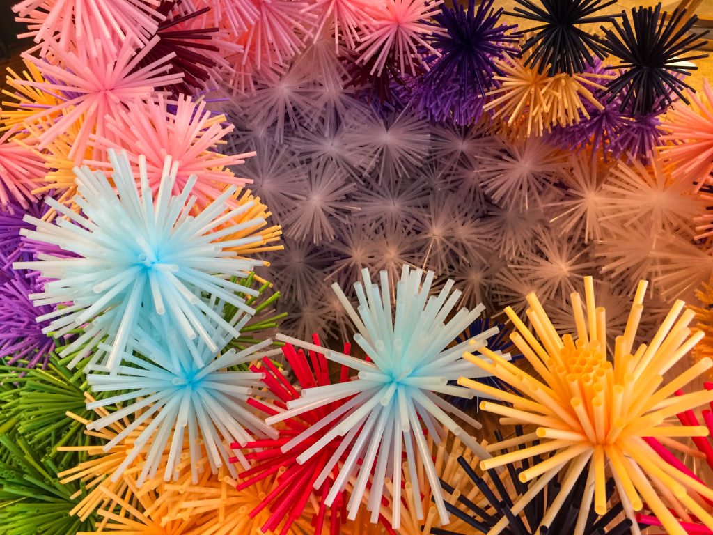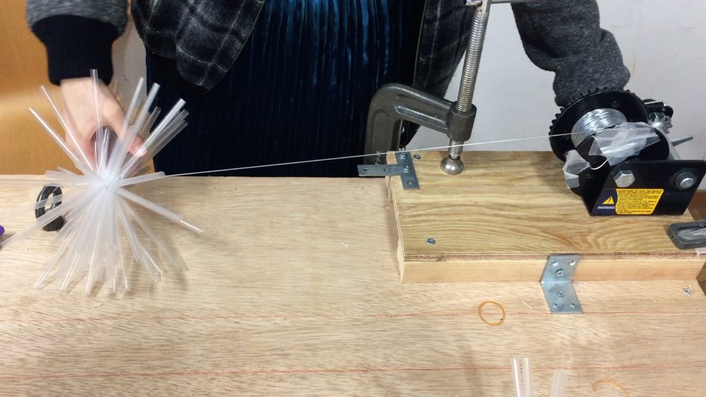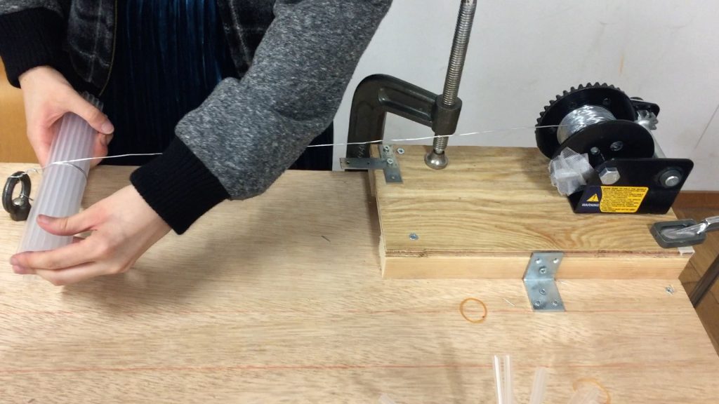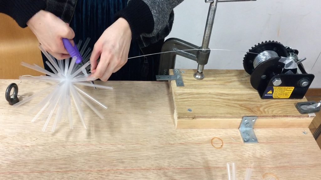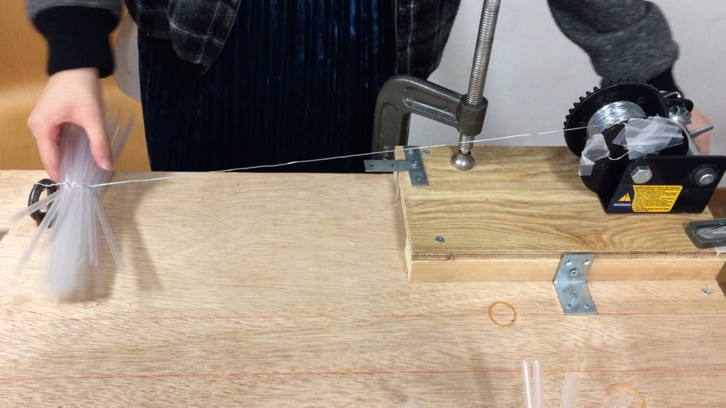 ストローは製造元や種類・カラーによって、摩擦力やしなやかさが変わるので、それぞれ全ての種類と、ストローの量、束ねるものの強さなど、それぞれの組み合わせで、実験・試作しました。そこら、最適なものを採用しました。