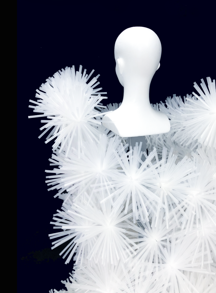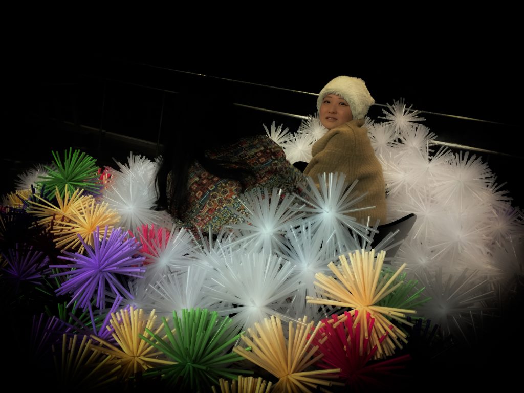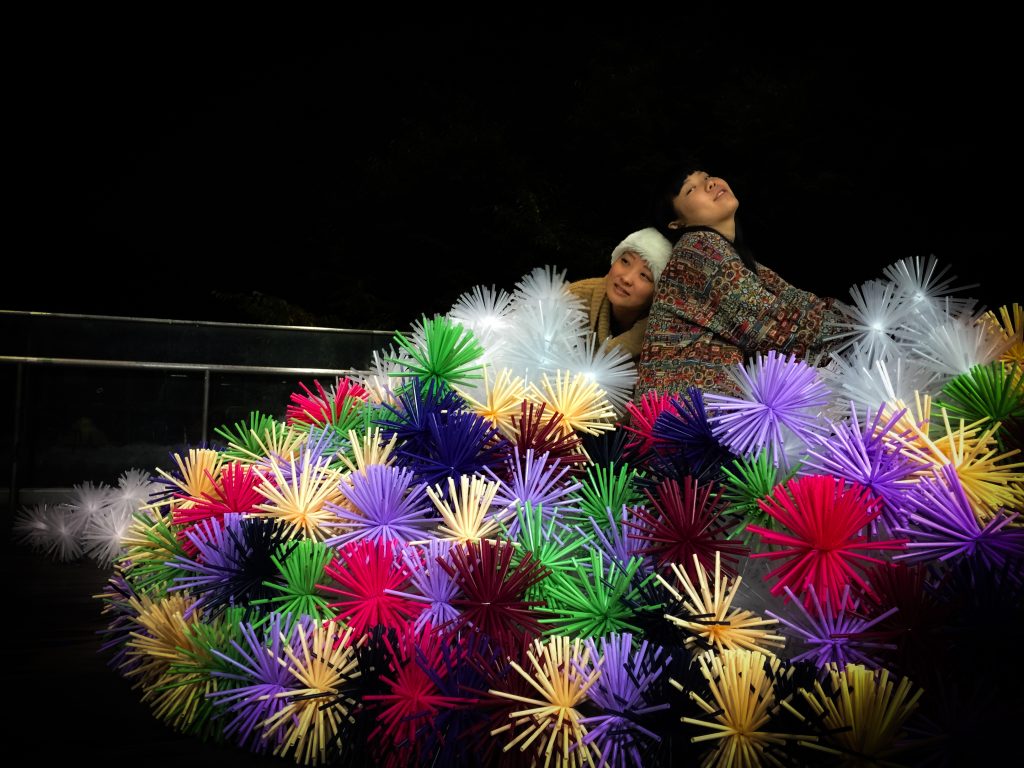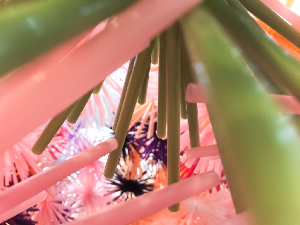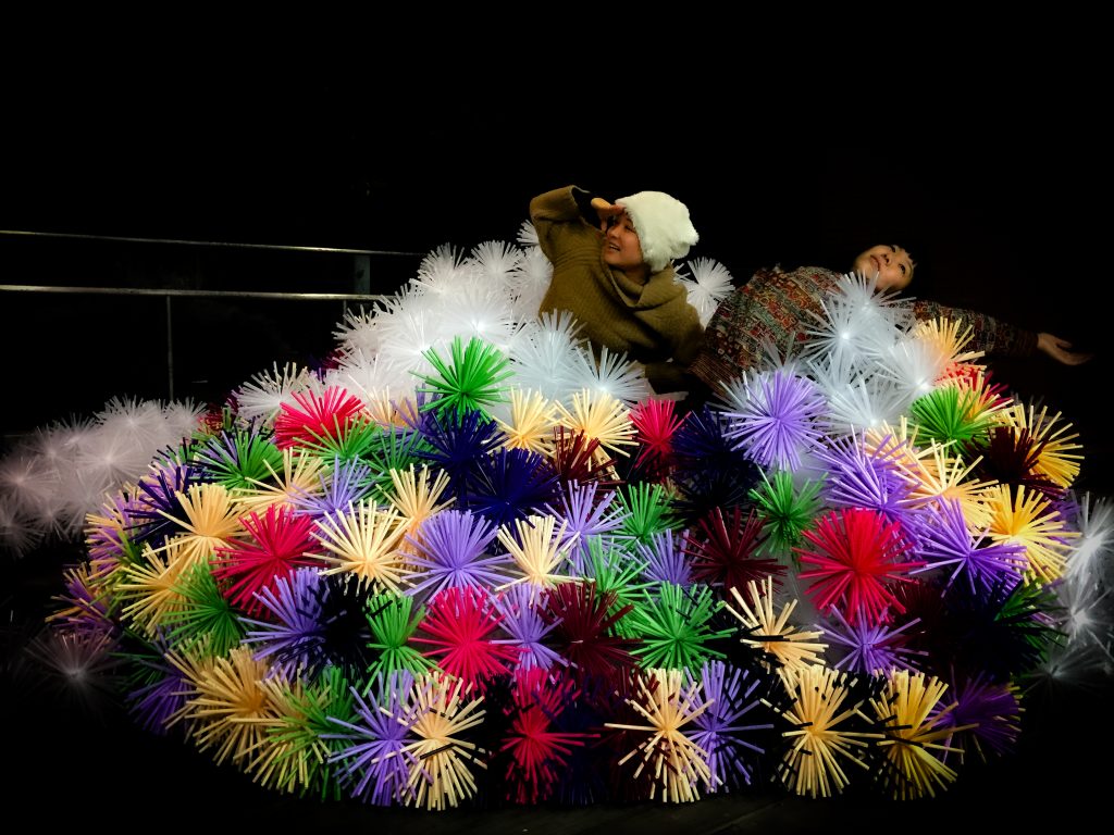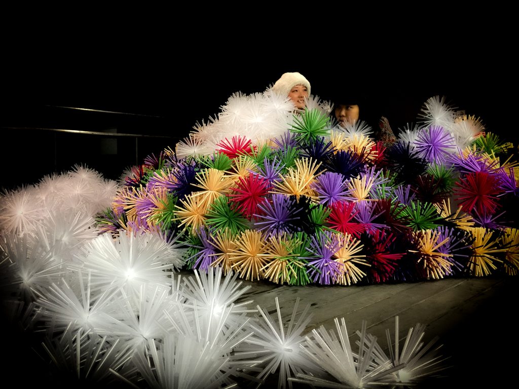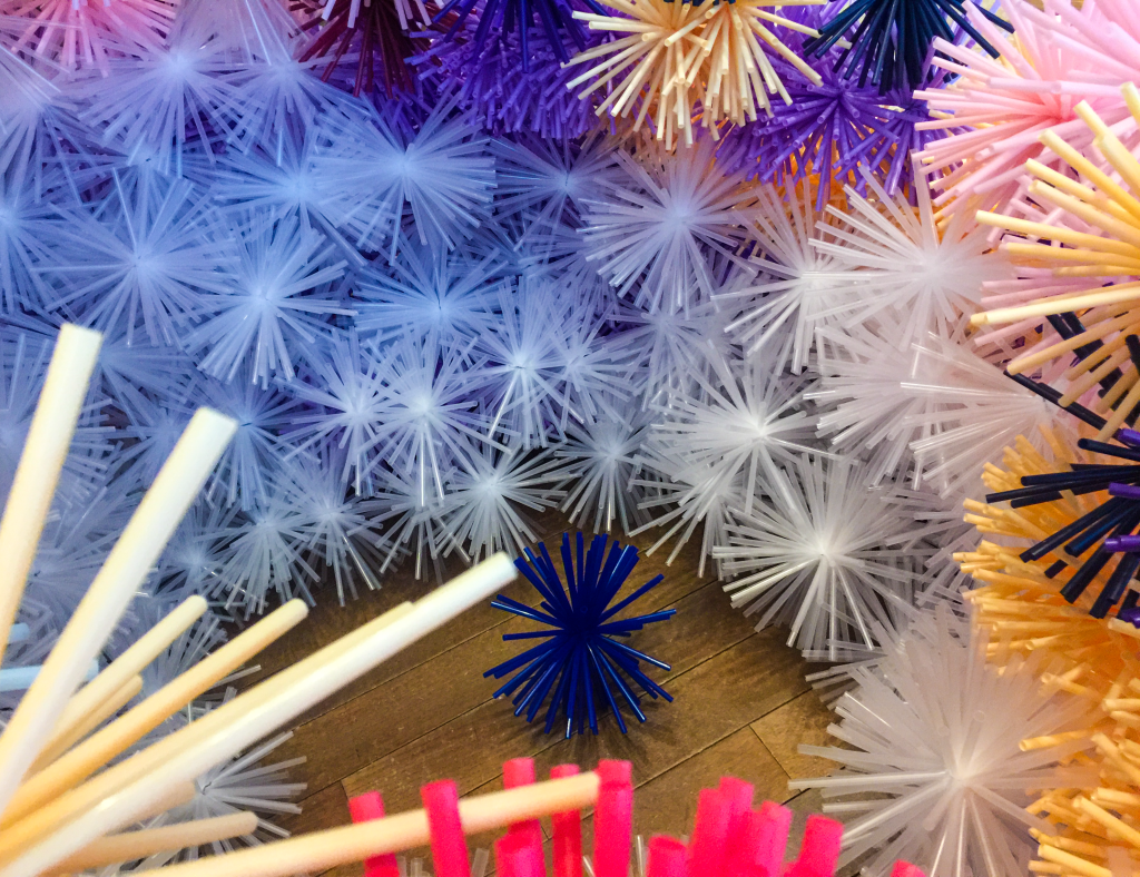 ストローを束ねて、雲丹や栗のような形状にして絡ませ合い、構造体と造形が一緒になって全体を構成します。